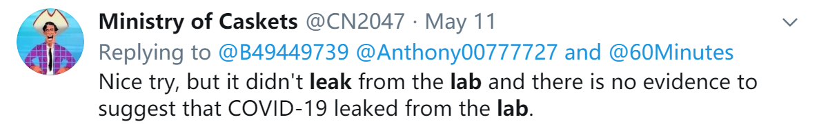 “说得不错,但病毒不是来源于实验室,因为目前没有任何证据表明病毒是从实验室泄漏的。”