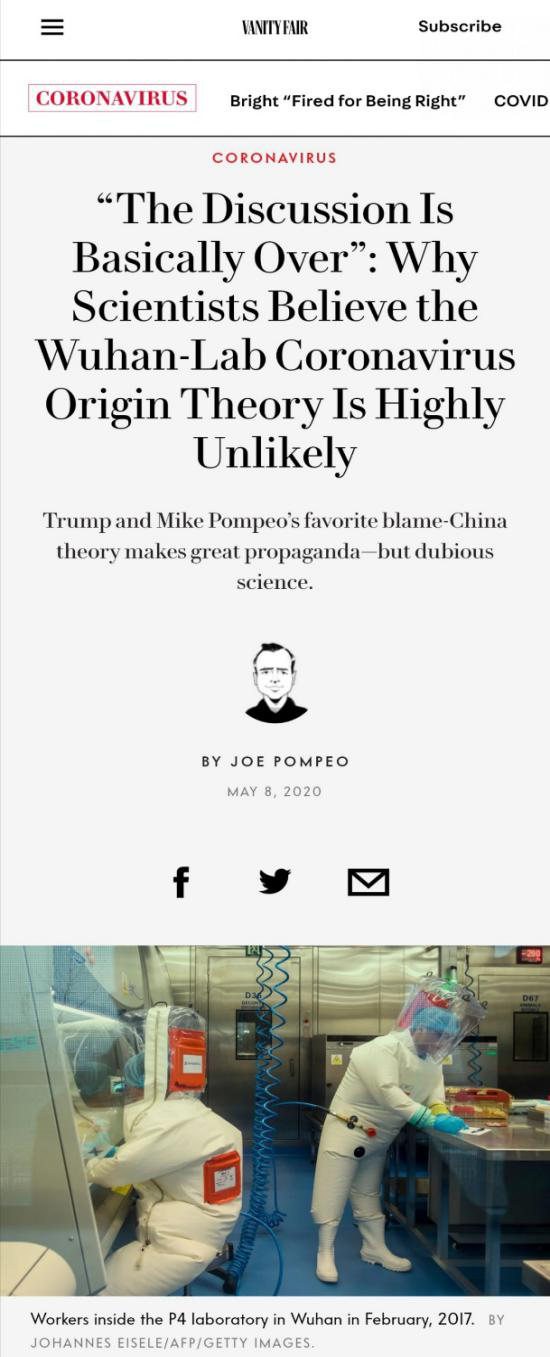 《名利场》这篇报道的记者乔·蓬佩奥(Joe Pompeo)调侃道:“因为找不到病毒源头,政府就有机会制造谣言了。而且实验室泄漏病毒事故就和很多好莱坞惊悚片一样,拥有完美的宣传效果。” 特朗普总统惯用的责备中国的伎俩有很强的洗脑效果,但是伪科学。