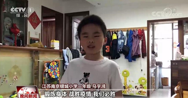 江苏南京银城小学一年级 马宇鸿:在家我学到了一些新技能。前滚翻、双手拍篮球、玩椭圆机……锻炼身体,战胜疫情,我们必胜!