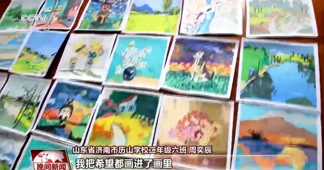 山东省济南市历山学校二年级六班 周奕辰:这是疫情好转后我第一次走进田野里写生的时候画的,我的画里有春天的小草、田野,我把希望都画进了画里。