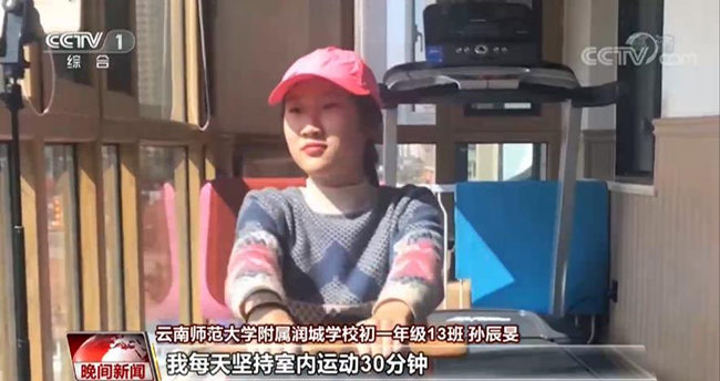 云南师范大学附属润城学校初一年级13班 孙辰旻:在爸爸的陪伴下,我每天坚持室内运动30分钟,室外运动1小时。体育运动不仅能提升我的身体素质,还能不断磨练我的意志,增强我的自信。