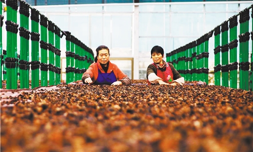 贵州印江木黄食用菌园区里,农民在摊晒黑木耳。 左禹华摄(中经视觉)