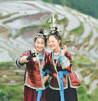 贵州省从江县侗族姑娘直播引客,发展旅游,助力当地脱贫。