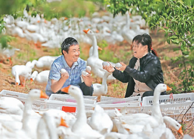 江苏宿迁贫困户王克林夫妇养鹅脱贫。