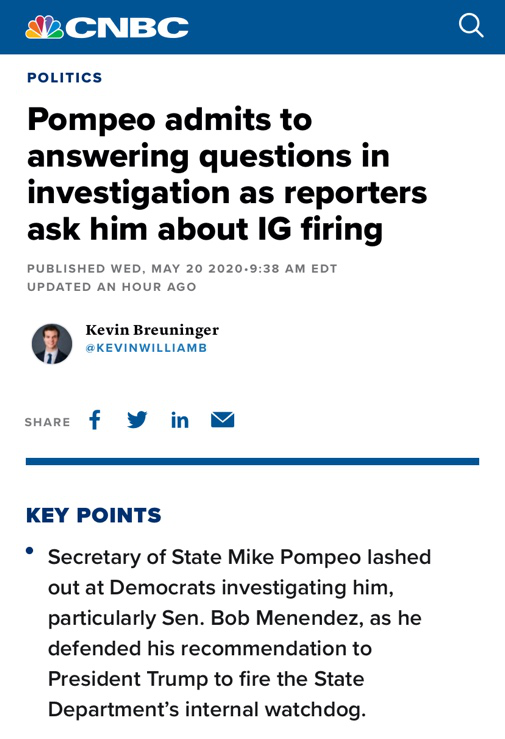 利尼克的调查显示,特朗普或曾试图通过宣布国家进入“紧急状态”而绕过国会向沙特和阿联酋销售高达80亿美元的军火。对此,蓬佩奥5月19日表示,他拒绝接受与此有关的任何采访。舆论认为,这正表示,蓬佩奥知道利尼克目前正在进行的调查,并看出了利尼克对此的质疑。由于触犯了蓬佩奥的政治野心并对特朗普不利,最终利尼克遭遇了被解雇的恶意报复。