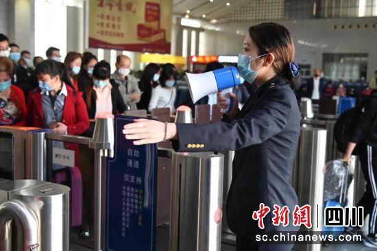 王天慧在检票口向旅客进行安全乘车宣传。 绵阳车务段提供