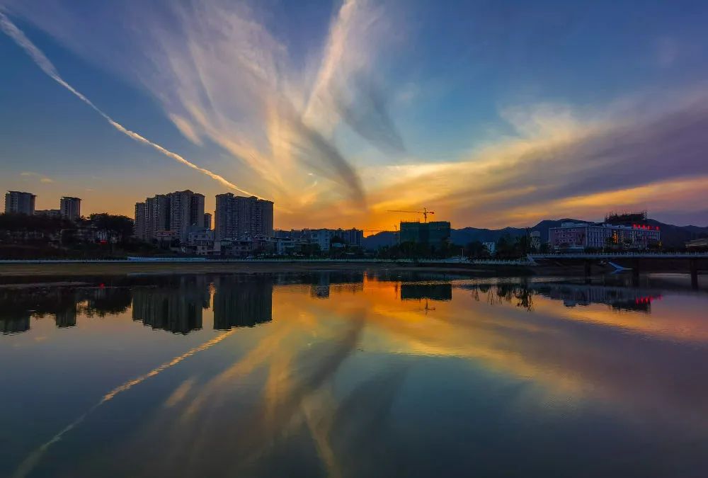 晚霞倒映在流经翁源县城的滃江(4月27日摄)。新华社记者 刘大伟 摄