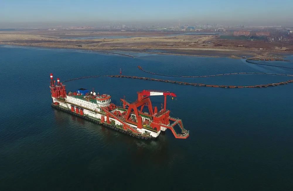 3月14日,一艘施工船在唐山港京唐港区25万吨级航道工程海域施工作业(无人机拍摄)。新华社记者杨世尧摄