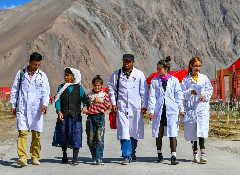 新疆塔什库尔干塔吉克自治县达布达尔乡热斯喀木村村医发尔亚特·塔西白克(右三)与医务人员来到当地易地扶贫搬迁安置点出诊(2019年7月7日摄)。新华社记者 胡虎虎 摄