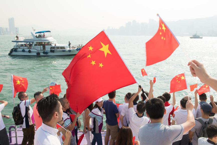 2019年10月1日,约300名香港市民在维多利亚港,以游船方式庆祝新中国成立70周年。新华社记者 翁忻旸 摄