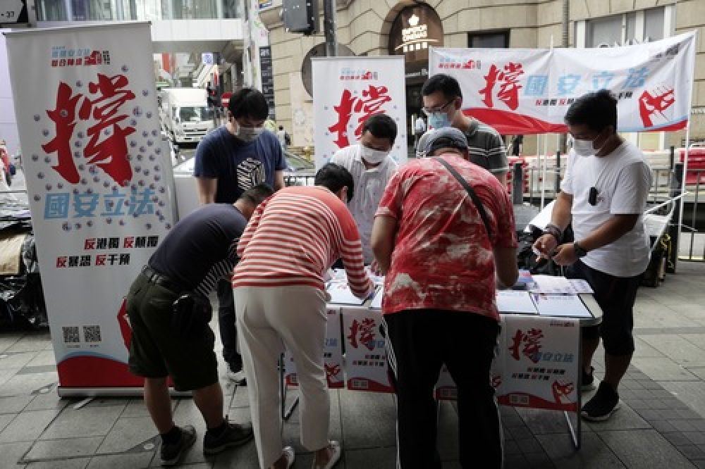 市民在香港皇后大道中和毕打街交界处的“撑国安立法”街站签名。新华社记者王申 摄