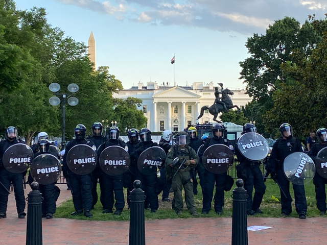5月30日,大批警察聚集在白宫门前,对示威者虎视眈眈。图源:央视新闻