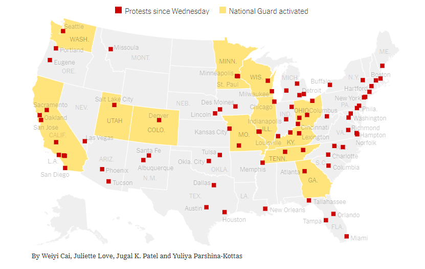 据美国媒体统计,抗议活动已席卷全美70多个城市,至少40个城市实施宵禁,5000名国民警卫队队员已分别部署在15个州和哥伦比亚特区,以应对示威活动中的突发事件。