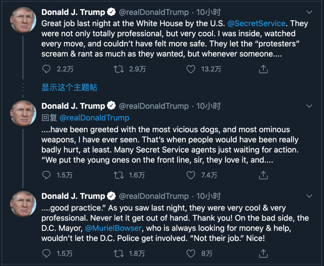 在白宫及地堡中感到“无比安全”的特朗普,30日早晨连发4条推特,称赞特勤局“昨晚在白宫干得好,不仅非常专业,而且非常酷”。“我在里面(白宫)注视着每一个人的一举一动,感到无比的安全。”