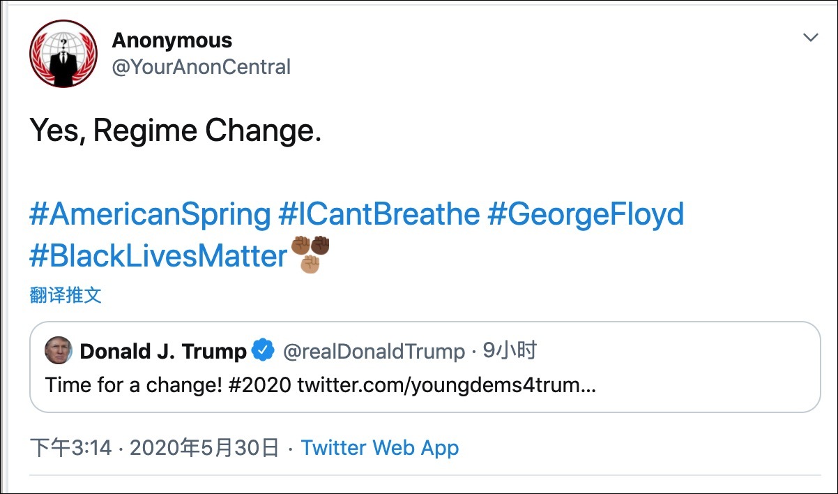 有人转发特朗普“是时候改变了”的推特,写道,“是的,政权更迭。”并带上了“美国之春”、“我无法呼吸”、“黑人生命重要”等标签。