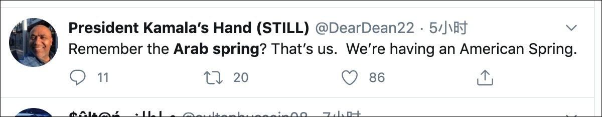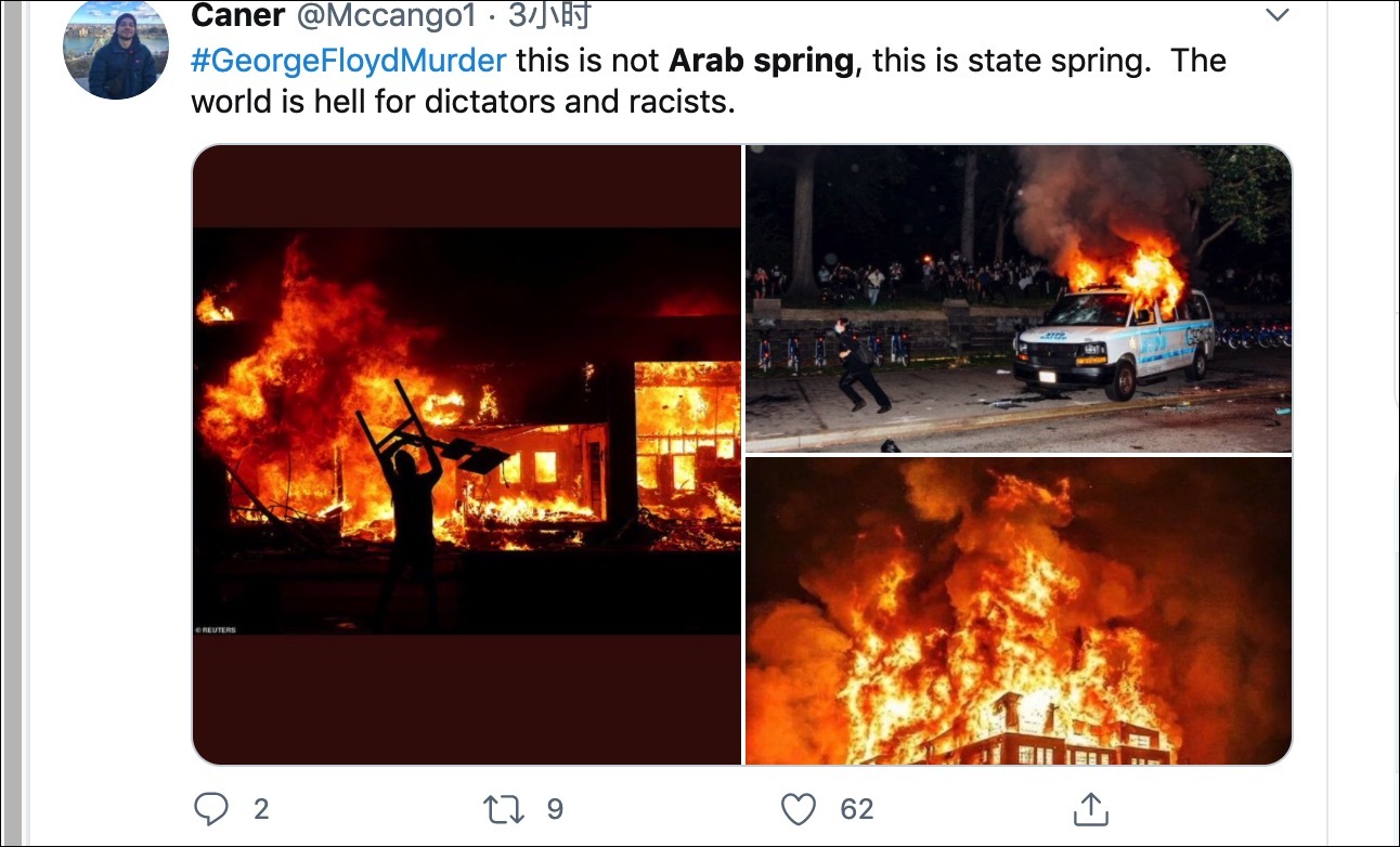 在推特上,不少人都由此联想到了“阿拉伯之春”,并将此事称为“美国之春”。有人说,“还记得阿拉伯之春吗?我们正在经历美国之春。”