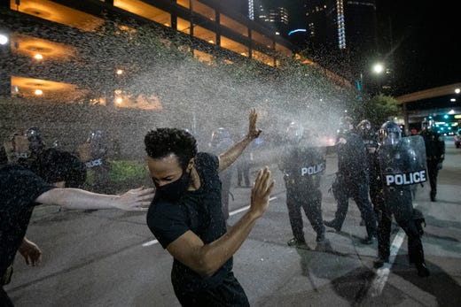 身穿防暴装备的底特律警察向抗议者喷洒胡椒喷雾 图源:底特律自由新闻报
