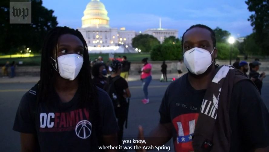 有抗议者在接受采访时说:“我们讨厌这样,但是我们理解,那是必须经历的部分……不管这是不是阿拉伯之春,或者其他类似的事情,有时候你必须要让事情发展到这种程度。”他们的背后,是夜幕里的国会山。