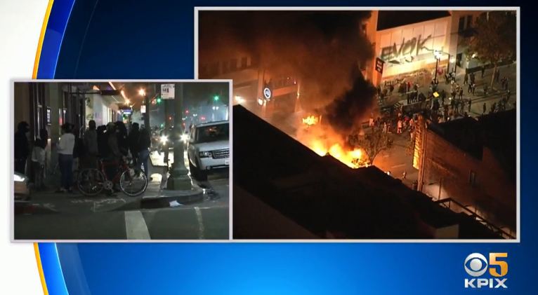 在加州奥克兰市,抗议活动在晚上逐渐变得暴力,有破坏公物、盗窃、纵火和袭警事件发生。
