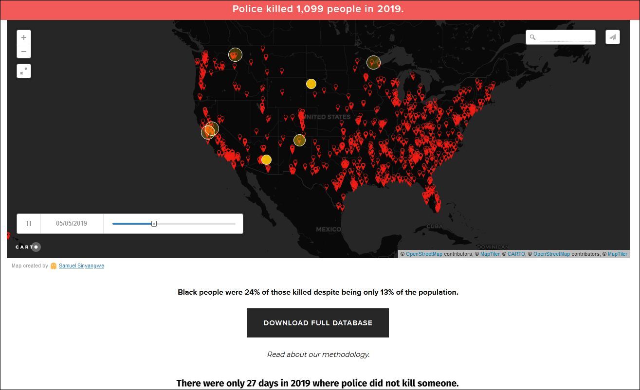 根据警察暴力统计网站,2019年,美国警察杀死1099人,全年警察没有致人死亡的日子只有27天。黑人只占美国人口的13%,但这1099人中,24%是黑人。