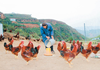 49岁的张周平是村里的6户养鸡户之一。“一年前,听说村里给贫困户免费修鸡舍、送鸡苗,我就响应工作队的号召,将家里的一处荒废老宅子利用起来养了50只鸡,每天只要喂两次纯粮食饲料,也不影响种地。通过养鸡,我增收了5000多元。”张周平乐滋滋地说。