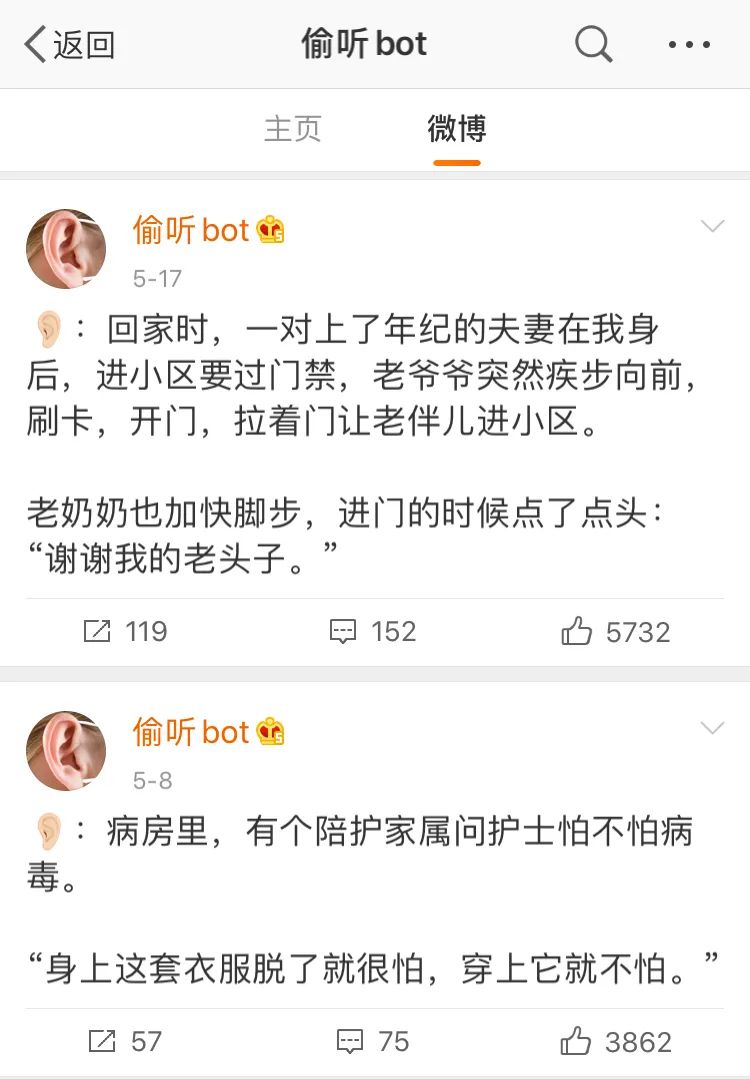 一是倾听。“偷听Bot”发布了一件几乎可以拧出泪水的事,意难平的“偷听Bot”粉丝纷纷为网友鸭鸭的留言点赞。网友鸭鸭写道:“从未想过我的投稿会被发出来,能在这么大的网络世界拥有一块属于自己的秘密花园,谢谢大家让我知道这世界上还有盏灯为我亮着。”