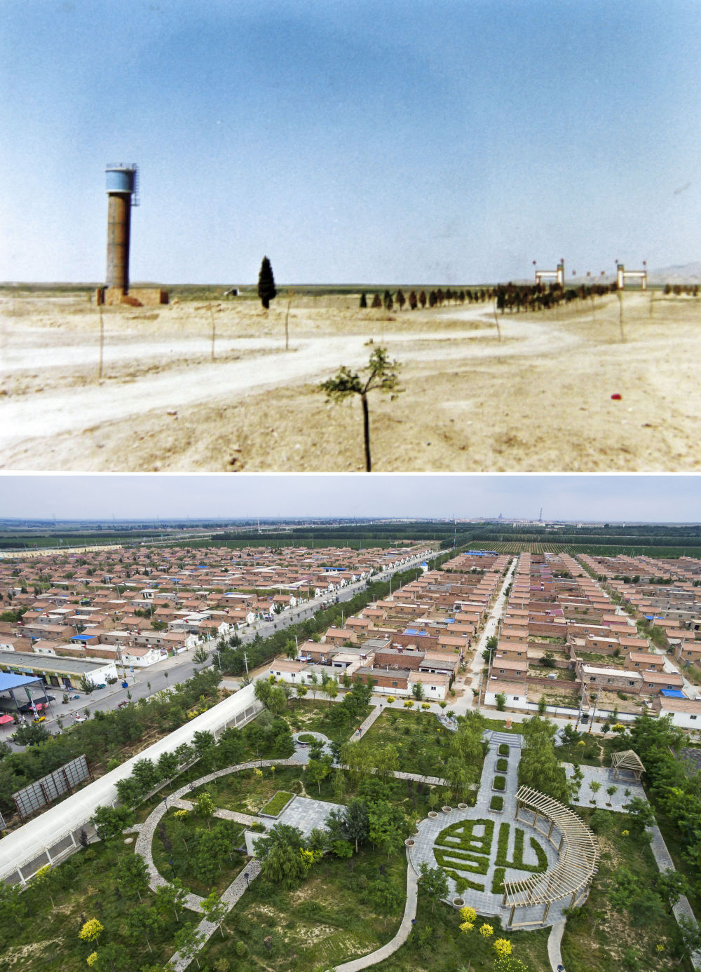 拼版照片:上图为宁夏永宁县闽宁镇建设初期的乡镇雏形(资料照片);下图为俯瞰宁夏永宁县闽宁镇原隆移民村(2016年7月22日摄,新华社记者 王鹏摄)