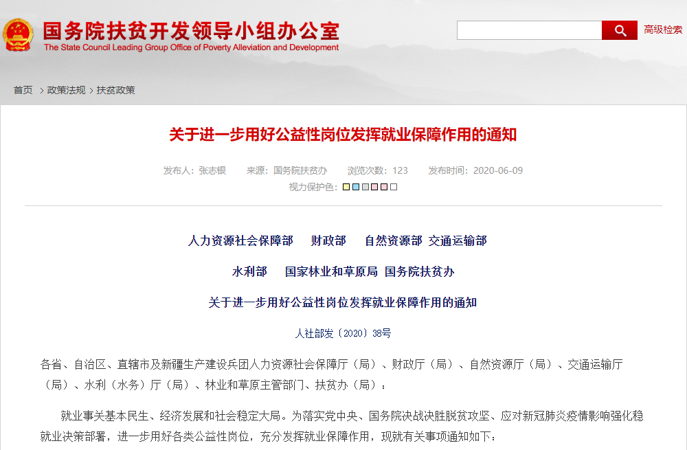 就业事关基本民生、经济发展和社会稳定大局。为落实党中央、国务院决战决胜脱贫攻坚、应对新冠肺炎疫情影响强化稳就业决策部署,进一步用好各类公益性岗位,充分发挥就业保障作用,人力资源和社会保障部、国务院扶贫办等七部门联合印发《关于进一步用好公益性岗位发挥就业保障作用的通知》,要求各地要高度重视公益性岗位有关工作,将其作为当前今后一段时期稳定和扩大就业的重要举措,摆在更加突出位置。压实工作责任,加强资金保障,推动政策落实,强化日常调度与集中督查。统筹各方资源,形成工作合力,加强部门间协同配合,切实发挥公益性岗位“兜底线、救急难”作用。