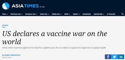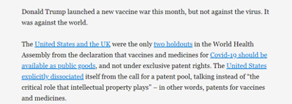 世界卫生大会倡议,将治疗新冠肺炎的疫苗和药物作为公共产品,而不享有独有专利,美国和英国是唯二反对这一提议的国家。美国明确反对建立专利池的呼吁,大谈特谈“知识产权发挥的关键作用”,即疫苗和药物的专利。