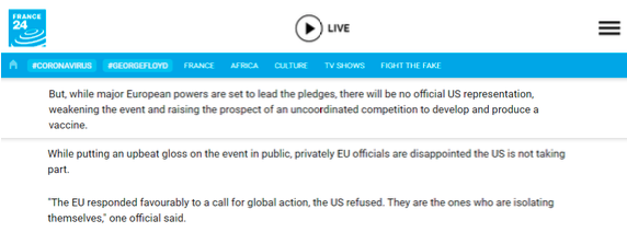 主要的欧洲国家将率先做出认捐承诺,而美国却并未派正式代表出席,大大削弱了这一活动的影响力,并引发对于疫苗研发无序竞争的担忧。