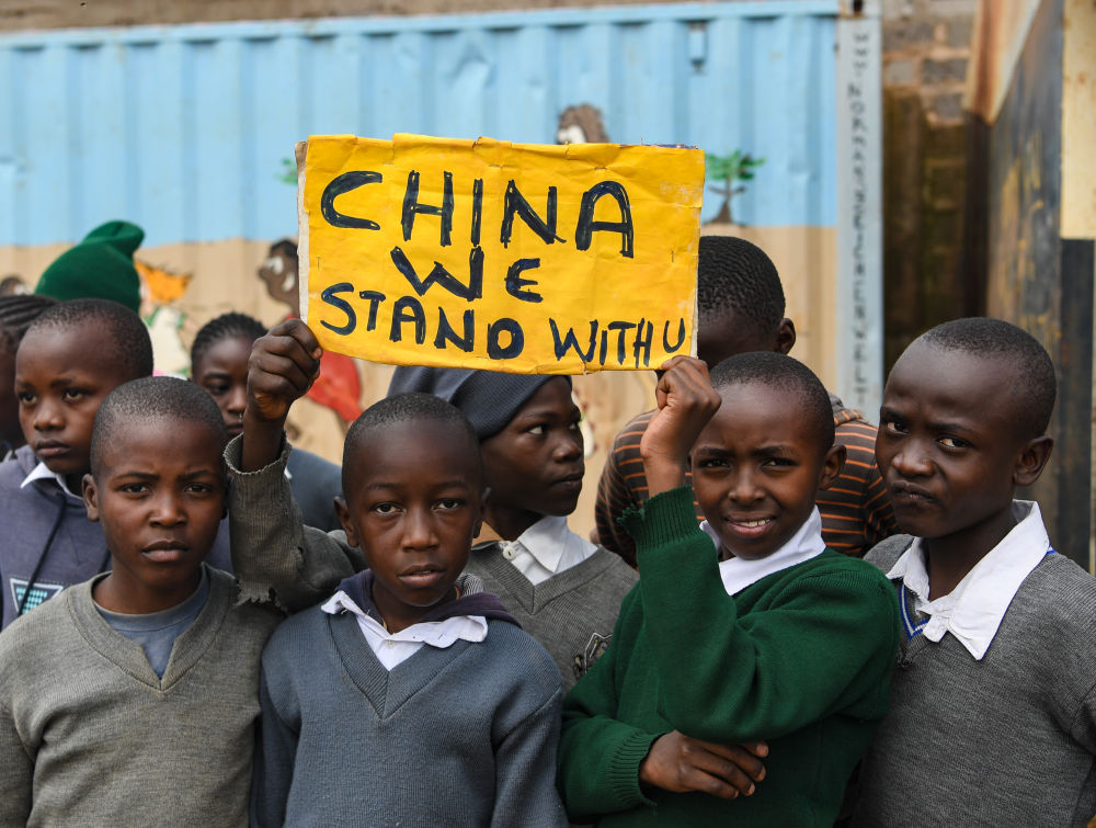 2月19日,在肯尼亚内罗毕,马萨雷贫民区的小学生展示标语牌,表达对中国的关心和祝福。标语牌上写着:中国,我们和你在一起。(新华社记者李琰摄)
