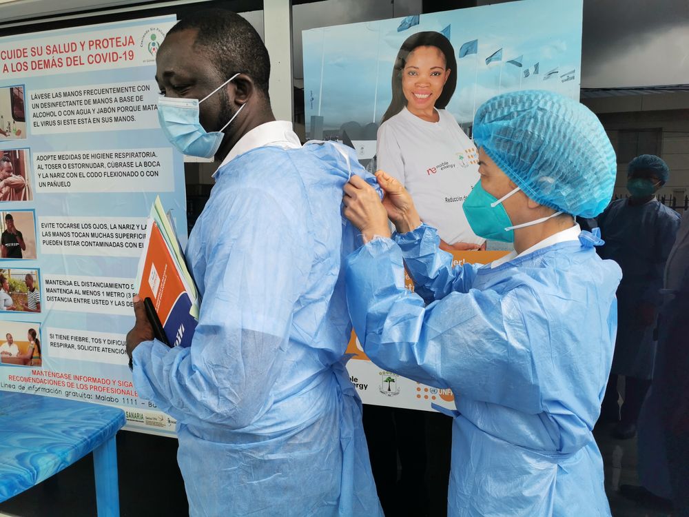 6月1日,在赤道几内亚首都马拉博,中国抗疫医疗专家组考察一所收治新冠患者的定点医院。为支持非洲国家抗击新冠肺炎疫情,中方向非洲国家派出抗疫医疗专家组。中方医疗专家组与非洲国家有关部门和医务人员深入交流,分享抗疫经验,对话社区民众,考察定点医院和实验室,指导中国援地区国家医疗队在当地开展抗疫工作,受到有关国家高度赞誉和广泛好评。新华社发(专家组供图)