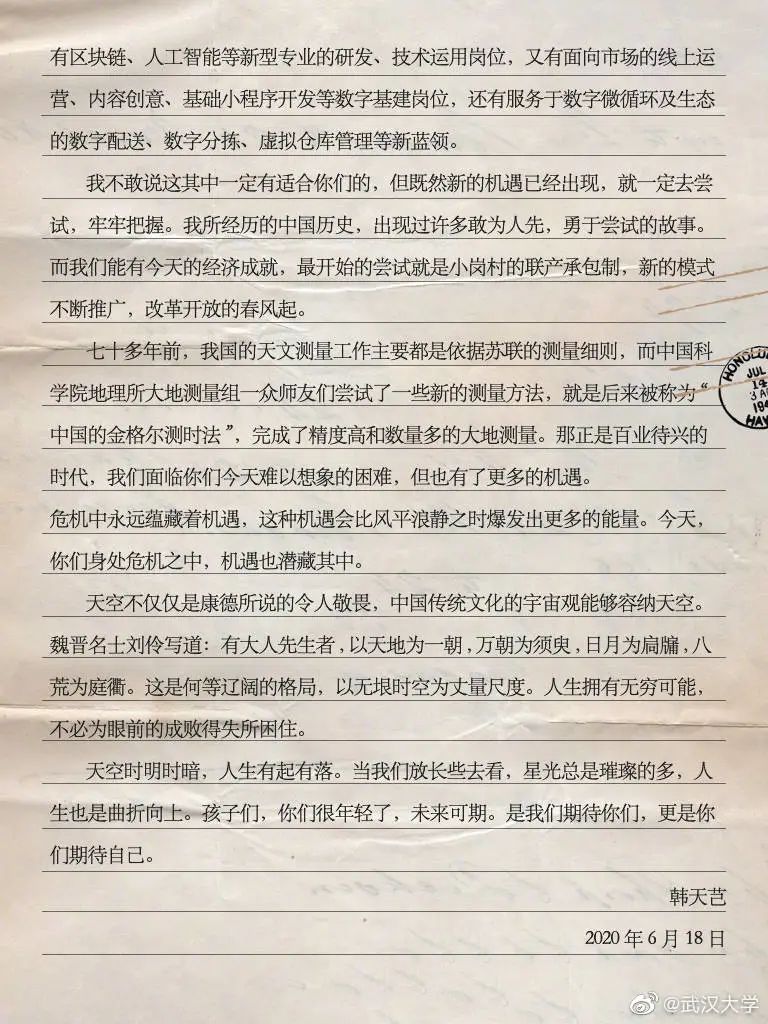 韩天芑1958年曾短暂任教于原武汉测绘科技大学(后并入武汉大学)天文学专业,教授金格尔测时法。今年,武汉大学和全国很多高校一样,经历了特殊的一学期,今年的毕业生也让韩老特别牵挂,他决定写一封信鼓励即将踏上人生新征程的毕业生们。