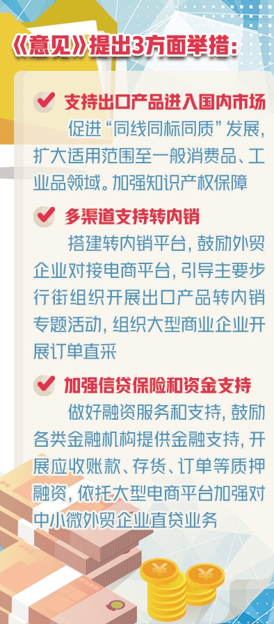 今年《政府工作报告》提出,围绕支持企业增订单稳岗位保就业,加大信贷投放,扩大出口信用保险覆盖面,降低进出口合规成本,支持出口产品转内销。