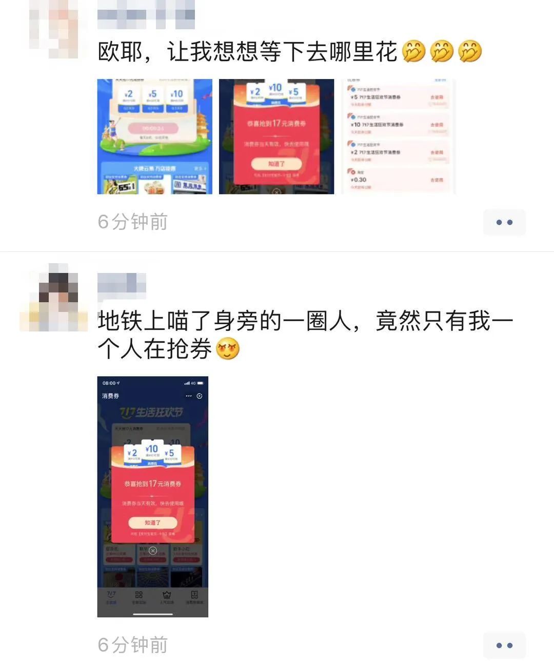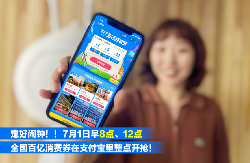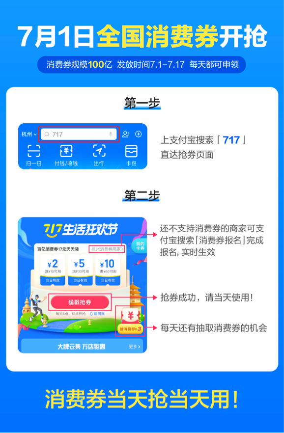 7月1日起,规模100亿元的全国版消费券正式开始发放。每天早上8点和12点,用户上支付宝搜“717”就可以领取,每次可一键领取3张,分别为10减2、30减5,60减10,可以连续领17天,当天领券,当天使用。