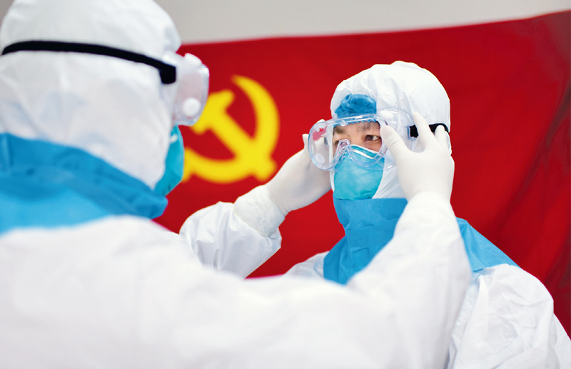 在抗击新冠肺炎疫情的战线上,广大党员干部不忘初心、牢记使命,挺身而出、冲锋在前,让党旗在疫情防控斗争第一线高高飘扬。图为2020年2月6日,重庆市璧山区人民医院感染疾病科疫情防控专家组副组长、党员丁飞穿好隔离服,准备前往隔离病房。人民图片 胡悦建/摄