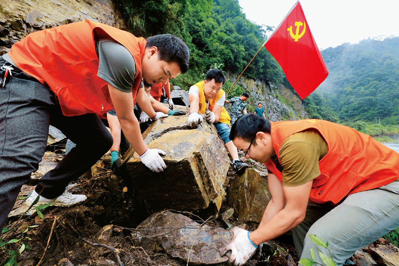 近日,贵州省黔东南苗族侗族自治州榕江县境内持续暴雨天气,暴雨引发山洪,造成公路塌方等自然灾害。图为2020年6月13日清晨,当地驻村党员干部、网格员组成的党员先锋抢险突击队,在榕江县两汪乡两汪村至上纽自然寨路段清除坍塌的石方。人民图片 李长华/摄