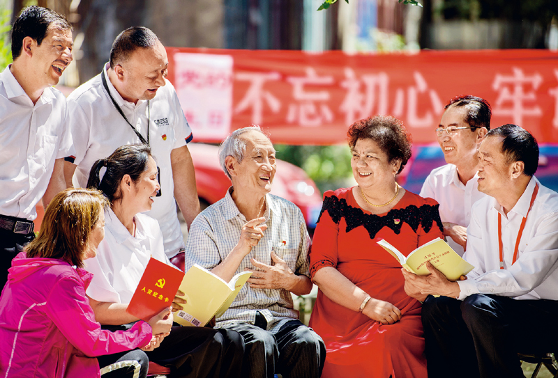 每年“七一”都是每个共产党员最骄傲自豪的时刻,也是铭记初心和使命、重整行装再出发的时刻。图为2018年7月1日,乌鲁木齐市天山区二道桥片区福寿巷社区的“民族团结模范庭院”里,各族党员围坐在一起庆祝党的生日。 人民图片 金炜/摄