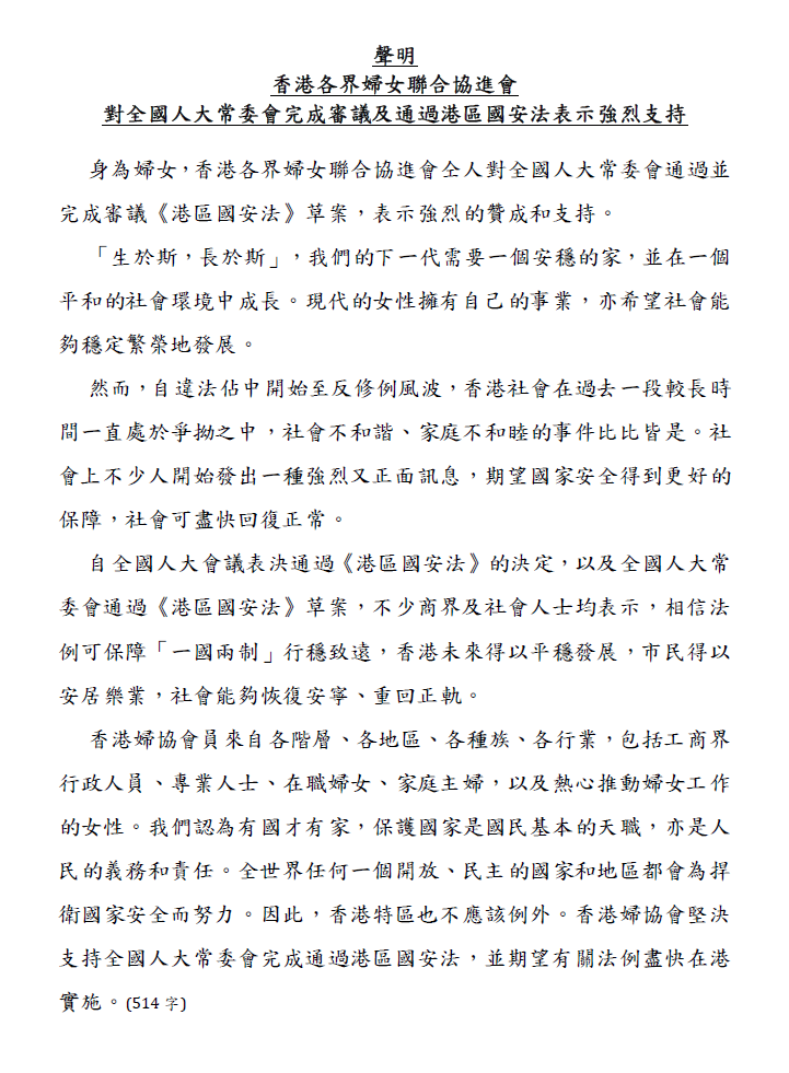 香港各界妇女联合协进会发表声明,坚定支持和拥护香港国安法,相信法律的实施可以保障“一国两制”行稳致远,香港未来得以平稳发展,市民得以安居乐业,社会能够恢复安宁、重回正轨。