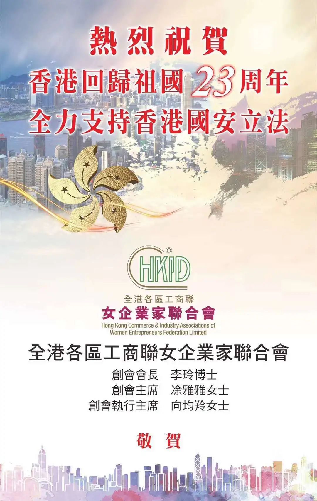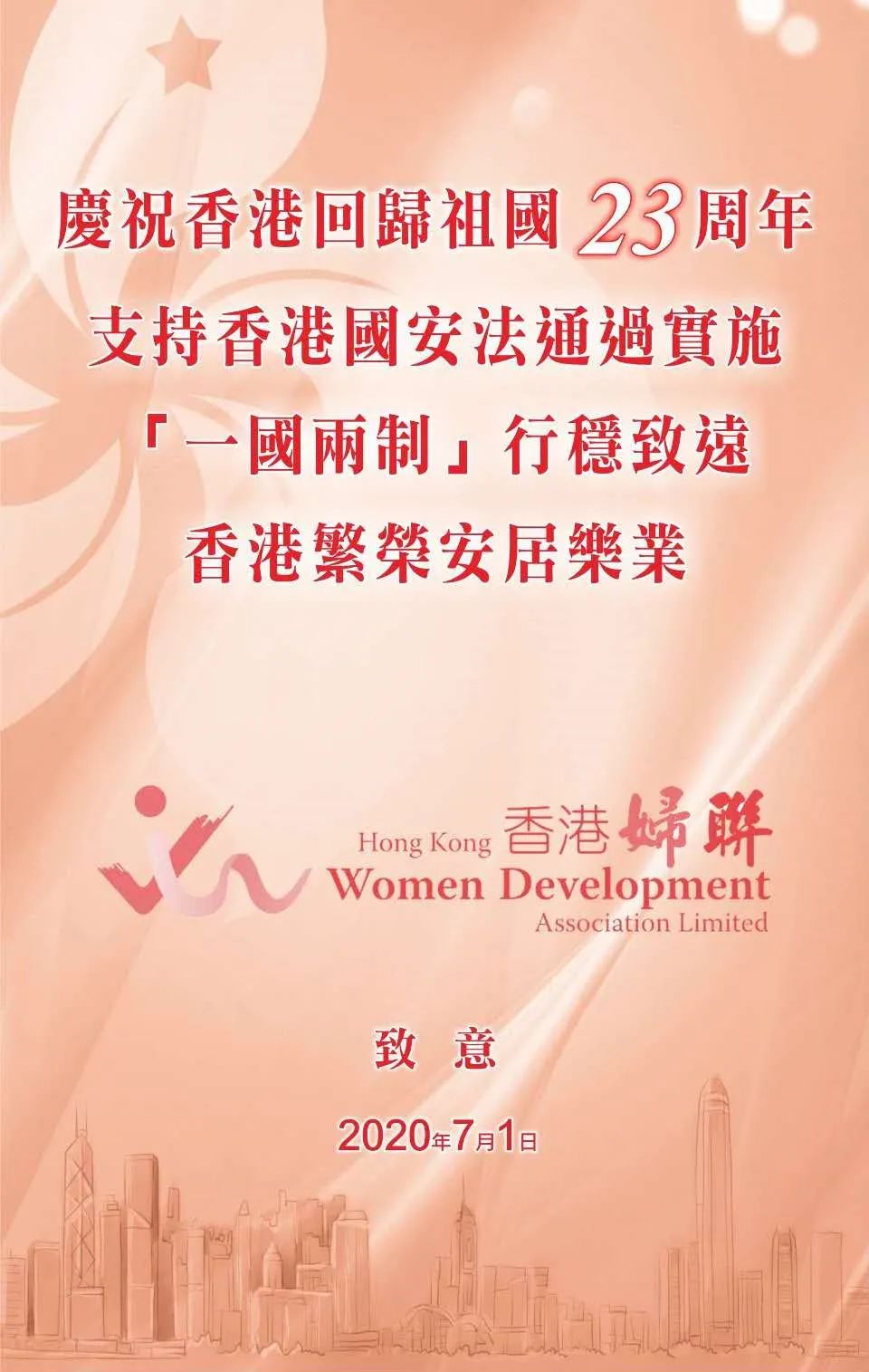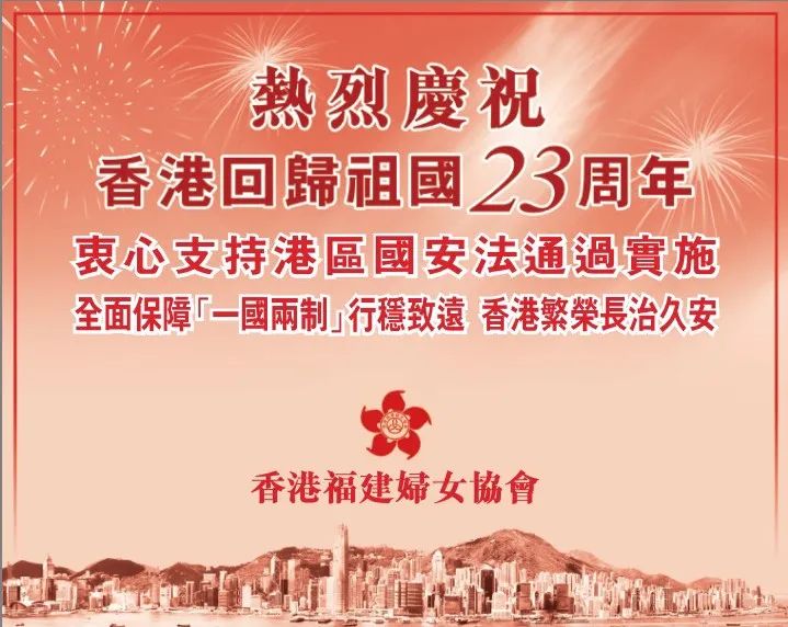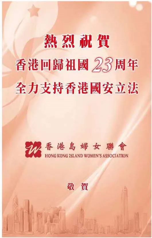 在香港即将迎来回归祖国23周年前夕,十三届全国人大常委会第二十次会议全票通过了《中华人民共和国香港特别行政区维护国家安全法》(以下简称香港国安法),并在香港刊宪实施。香港各界妇女及爱国爱港社团积极参与香港各界庆典委员会主办的庆回归系列活动,同时主动发声明、写文章,呼吁市民坚定支持香港国安法,全力维护国家安全。