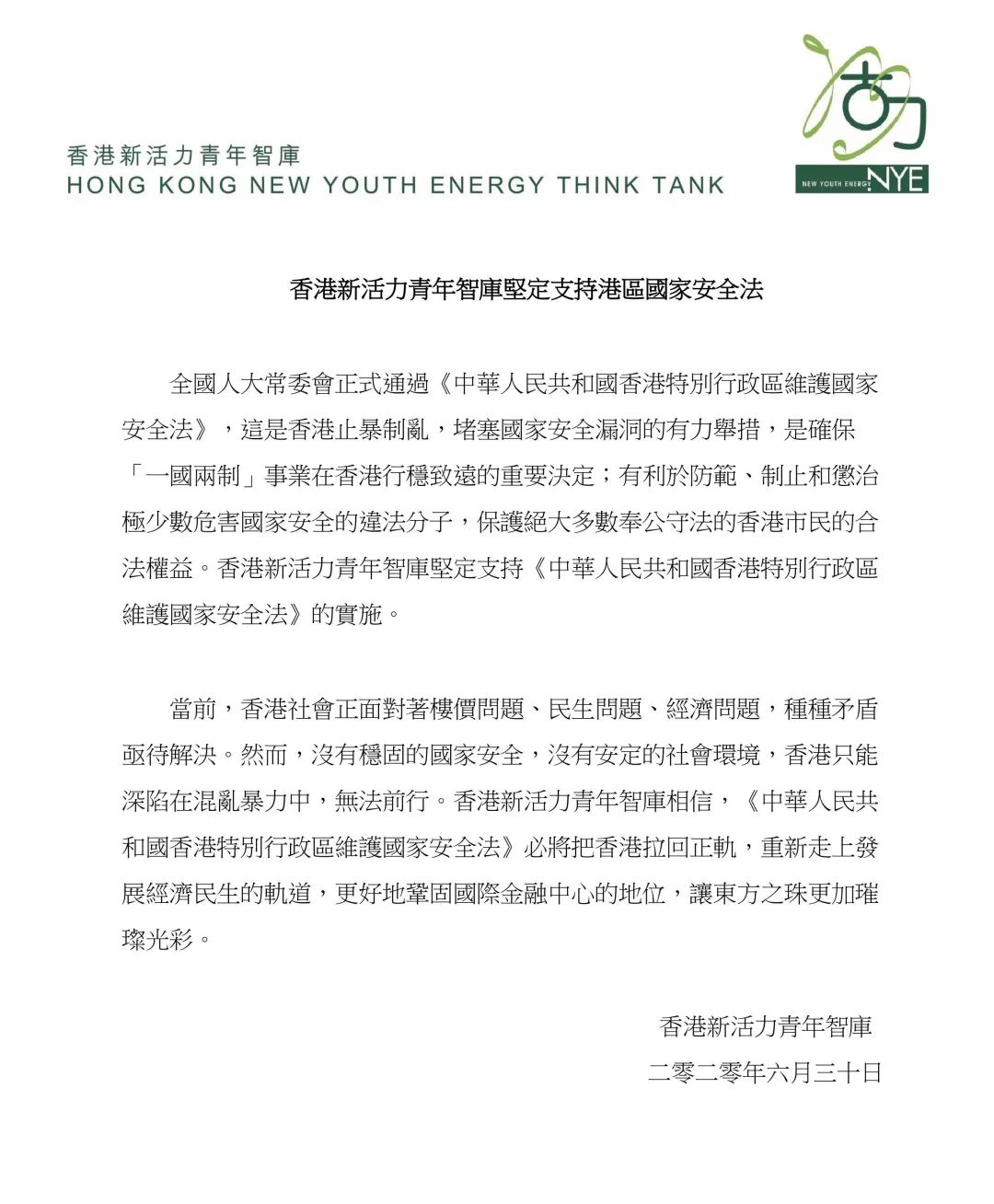 香港新活力青年智库表示,坚信香港国安法必将更好巩固香港国际金融中心的地位,让东方之珠更加璀璨光彩。