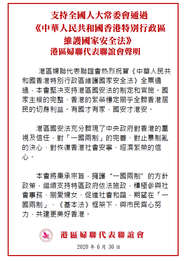 香港福建妇女协会、香港妇联、香港岛妇女联会、全港各区工商联女企业家联合会、广州外商投资企业商会发表声明,全力支持香港国安法,祝愿“一国两制”行稳致远,香港繁荣安居乐业。