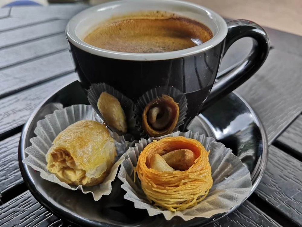 空气中弥漫着淡淡香甜,“祖父家”咖啡厅的阿拉伯甜点刚刚出炉——小麦粉拉丝卷成拇指大小的松脆鸟巢,裹起酥香的果仁。