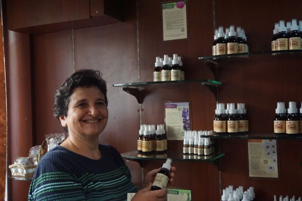 在叙利亚首都大马士革,鲁拉·阿迪卜展示自家企业生产的玫瑰纯露。新华社记者汪健摄