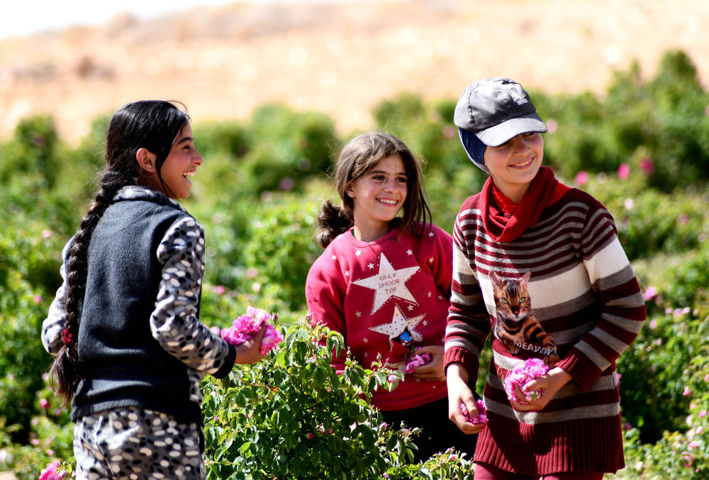 5月27日,在叙利亚大马士革北部,儿童采摘大马士革玫瑰。新华社发(阿马尔·萨法尔贾拉尼摄)