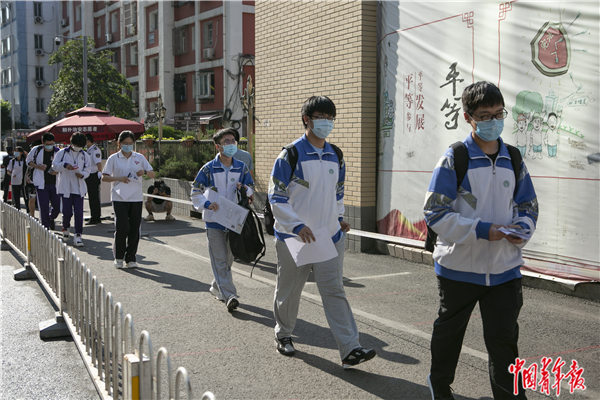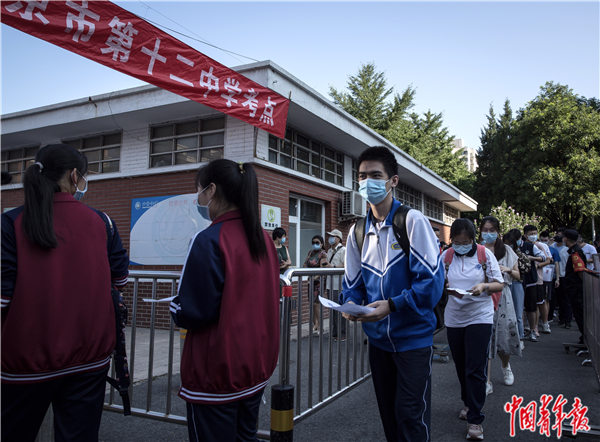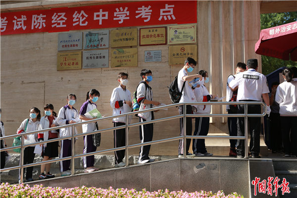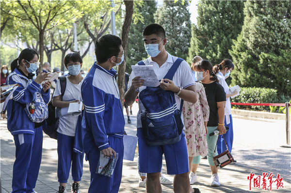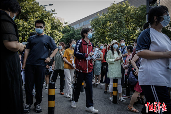 7月7日早晨,北京市朝阳区,陈经纶中学门口,考生排队准备进入考场。中青报·中青网见习记者 曲俊燕/摄