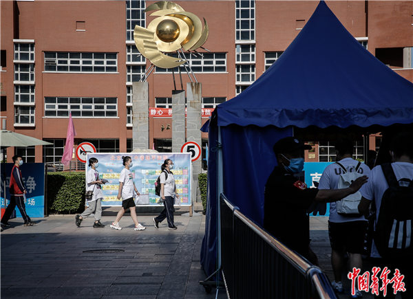 7月7日早晨,排队通过棚子里的自动测温设备后,考生们走进北京市第十二中学的校园,按照指引彼此保持距离、走向各自的考场。中青报·中青网记者 李峥苨/摄