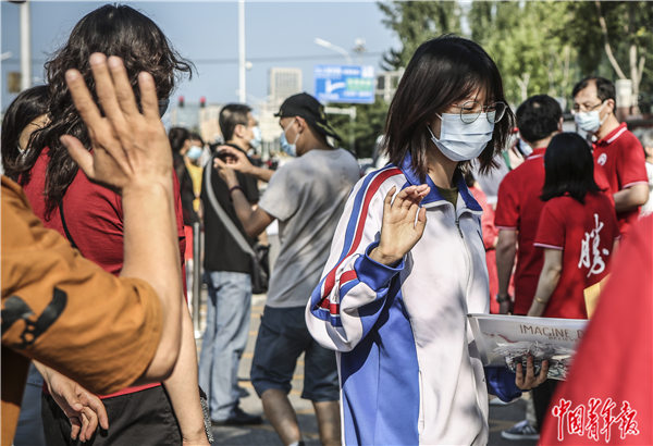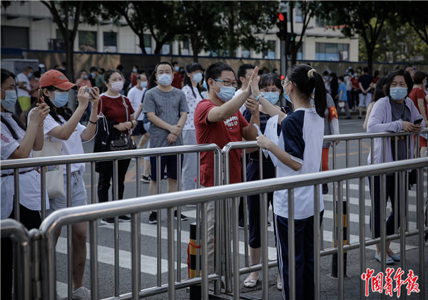 7月7日早晨,北京市朝阳区,中国人民大学附属中学朝阳学校(东校区)门口,一名考生在进入考场前与家人挥手。中青报·中青网见习记者 孔斯琪/摄