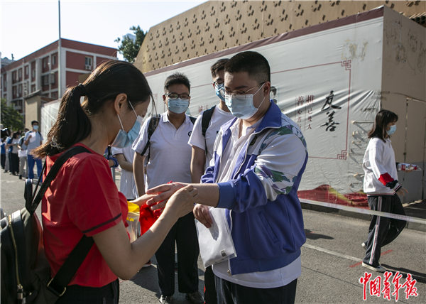 7月7日早晨,北京市朝阳区,陈经纶中学门口,一位老师为考生戴上代表幸运的红手链。中青报·中青网见习记者 曲俊燕/摄
