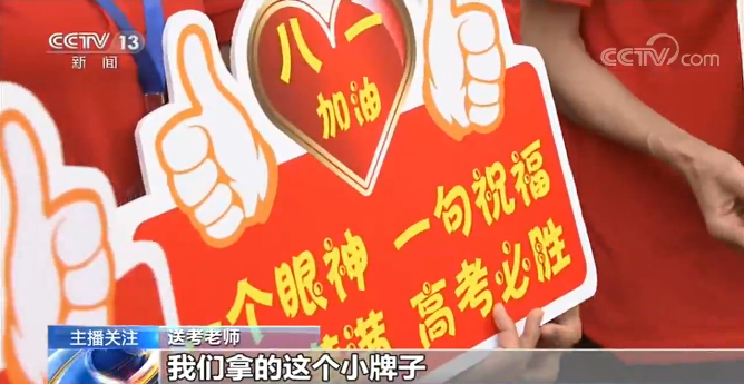 送考老师:红红火火,祝考生能开门红,取得好成绩。我们拿的这个小牌子是给学生的一些提醒和祝福。